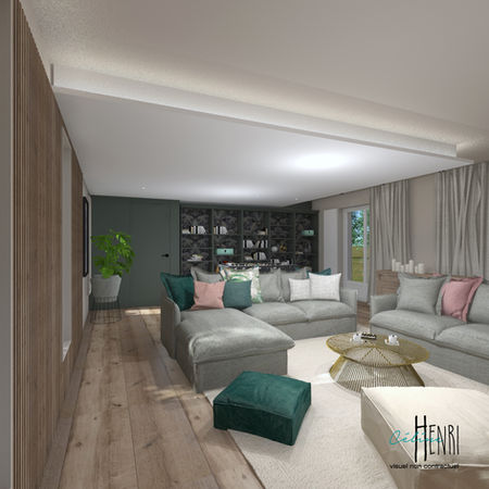 Gagner de la place et bénéficier d'une lumière traversante était notre objectif. Les petites fenêtres arrières actuelles sont proposées d’être agrandies en tombant leur allège. Inspirées de ce nouveau rythme donné par les entrées de lumière naturelle nous déployons un habillage bois sur ce mur et celui recevant l'écran, au-delà de l'approche esthétique, la réflexion acoustique est à prendre en considération dans un tel espace.